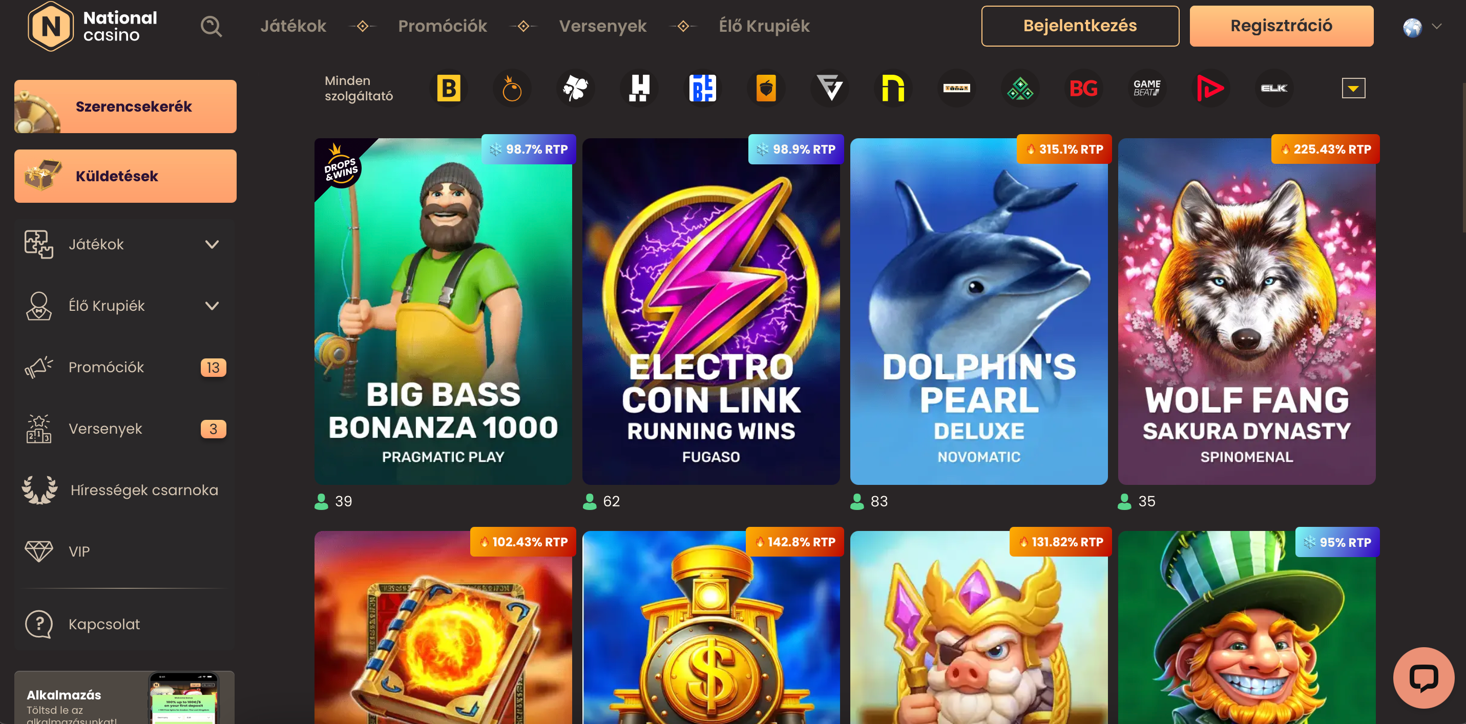 A kaszinó részlegben a legismertebb fejlesztők: mint a NetEnt, Play’n GO vagy Pragmatic Play játékaival találkozhatsz, ami garantálja a minőséget és a változatosságot.
